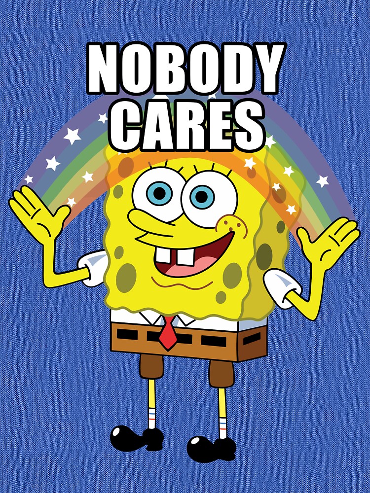 8+ Spongebob Memes Nobody Cares. Partagez un gif et feuilletez ces recherches gif associées. (250 points) * get a meme you've uploaded saved. Easily add text to images or memes. • spongebob is now a meanie. Spongebob rainbow, nobody cares, bob esponja tpm.